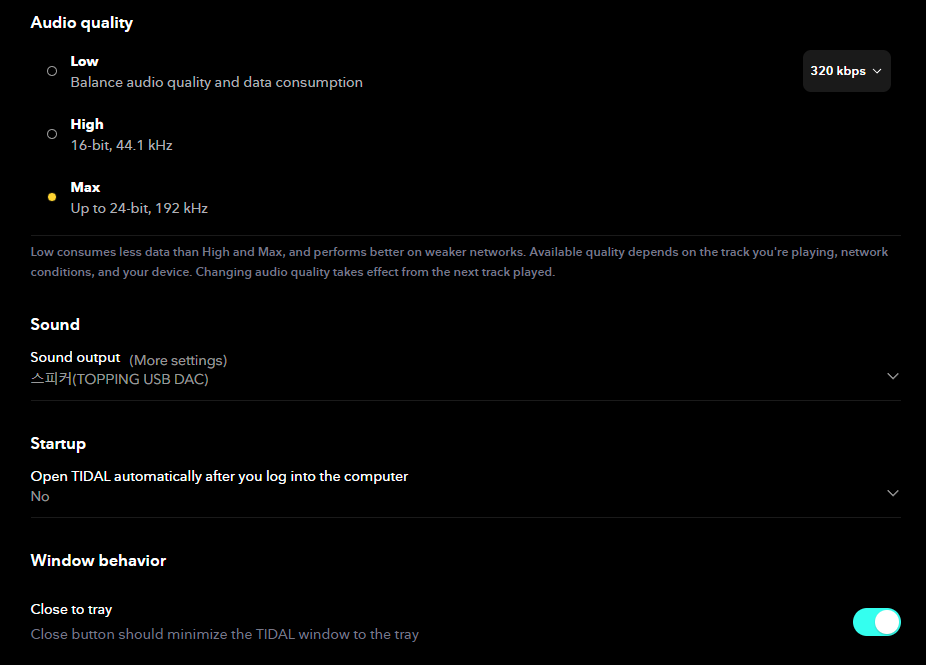 Exclusive mode는 이 출력장치를 타이달이 독점적으로 이용하게 하는 설정입니다.