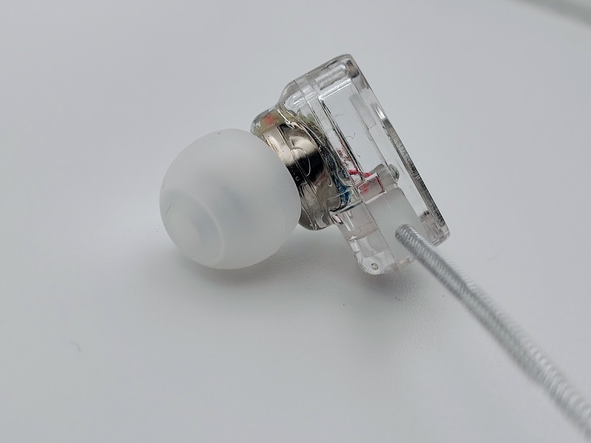 이어폰 자체는 다소 저렴해 보이는 투명한 플라스틱 소재지만, 깔끔한 디자인으로 전체적으로 보면 저렴한 느낌은 많이 줄어듭니다.