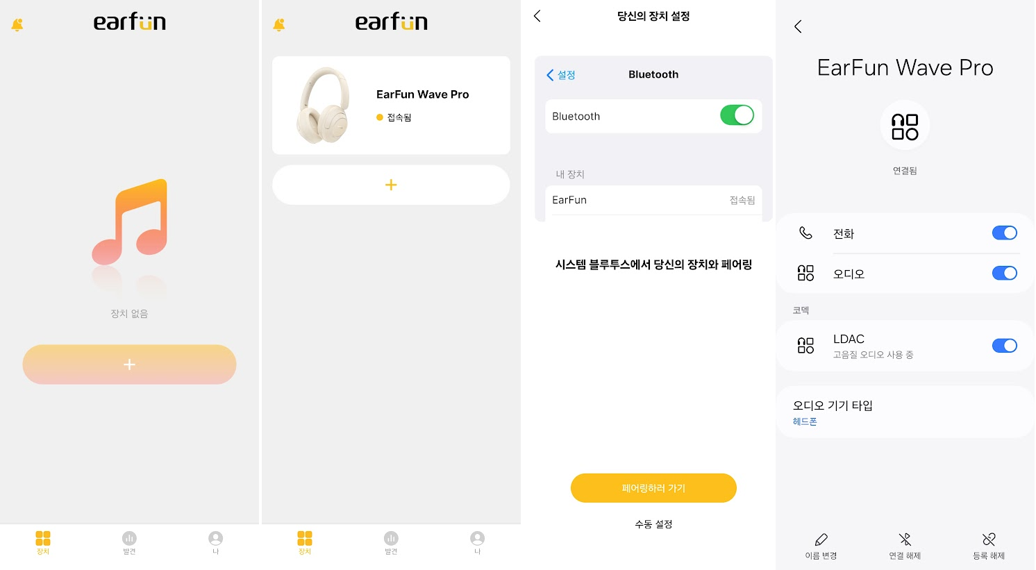 이어펀 오디오 어플을 설치하고 헤드폰의 전원을 켜면 페어링을 진행합니다.