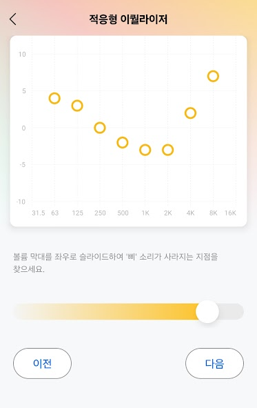 '볼륨 막대를 좌우로 슬라이드 하여 '삐' 소리가 사라지는 지점을 찾으세요'라는 안내문구에 따라 8개 밴드의 EQ를 각각 주파수의 삐 소리가 들리지 않을 때를 조정하는 수동 적응형 EQ였습니다.