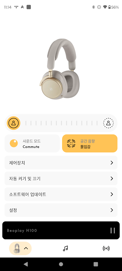 전용 어플을 지원하는 H100은 어플 내에서 사운드 모드와 공간음향을 선택할 수 있습니다.